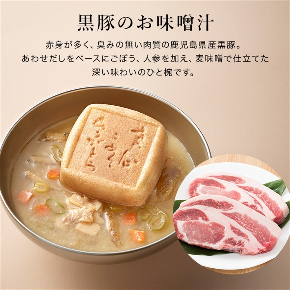 枕崎産の鰹節をふんだんに使った鰹節屋ならではの、だし薫るお味噌汁を、生餅をつき一枚ずつ手焼きした香ばしい最中で包みました。赤身が多く、臭みのない肉質の国産黒豚、白い宝石と言われる白海老を椀種に使用した、贅沢なお味噌汁の詰合せです。お湯を注ぐだけで手軽にお召し上がり頂けます。